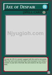 Axe of Despair Equip Spell Increase the ATK of a monster equipped with this card by 1000 points. When this card is sent from the field to the Graveyard, if you Tribute 1 monster on your side of the field, this card returns to the top of your Deck. SUPER RARE |