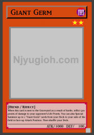 When this card is sent to the Graveyard as a result of battle, inflict 500 points of damage to your opponent's Life Points. You can also Special Summon up to 2 "Giant Germ" cards from your Deck to your side of the field in face-up Attack Position. Then shuffle your Deck.