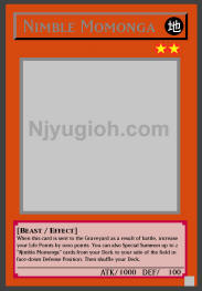 When this card is sent to the Graveyard as a result of battle, increase your Life Points by 1000 points. You can also Special Summon up to 2 "Nimble Momonga" cards from your Deck to your side of the field in face-down Defense Position. Then shuffle your Deck.