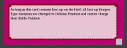 As long as this card remains face-up on the field, all face-up Dragon-Type monsters are changed to Defense Position and cannot change their Battle Position.