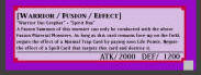 Ryu Senshi EARTH / Warrior-Type Fusion / Level 6 / ATK 2000 / DEF 1200 "Warrior Dai Grepher" + "Spirit Ryu" A Fusion Summon of this monster can only be conducted with the above Fusion Material Monsters. As long as this card remains face-up on the field, negate the effect of a Normal Trap Card by paying 1000 Life Points. Negate the effect of a Spell Card that targets this card and destroy it. COMMON |