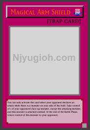 Magical Arm Shield Normal Trap You can only activate this card when your opponent declares an attack while there is a monster on your side of the field. Take control of 1 of your opponent's face-up monster, except the attacking monster, and this monster is attacked instead. At the end of the Battle Phase, return control of this monster to your opponent. ULTRA RARE |