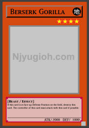 Berserk Gorilla EARTH / Beast / Level 4 / ATK 2000 / DEF 1000 If this card is in face-up Defense Position on the field, destroy this card. The controller of this card must attack with this card if possible. COMMON |