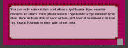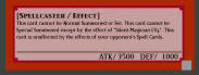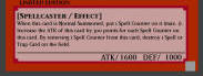 | Comments: | The thing with this card is that your opponent has to have at least 1 Spellcaster with under 2100 ATK for this card to activate, making it a pretty bad card overall. |