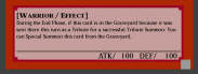 | Comments: | Slightly improved from its anime counterpart as it can bring back any FIRE Warrior from your Graveyard, including another copy of itself and has kept the anime version's ATK, DEF and Level to make it worth using even on its own! |