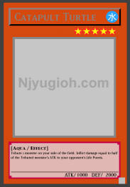 Catapult Turtle WATER / Aqua / Level 5 / ATK 1000 / DEF 2000 Tribute 1 monster on your side of the field. Inflict damage equal to half of the Tributed monster's ATK to your opponent's Life Points. RARE |