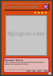 Cannon Soldier DARK / Machine / Level 4 / ATK 1400 / DEF 1300 Tribute 1 monster on your side of the field to inflict 500 points of damage to your opponent's Life Points. RARE |