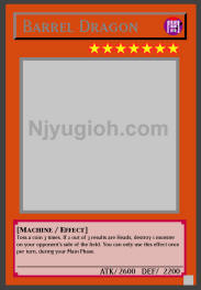 Barrel Dragon DARK / Machine / Level 7 / ATK 2600 / DEF 2200 Toss a coin 3 times. If 2 out of 3 results are Heads, destroy 1 monster on your opponent's side of the field. You can only use this effect once per turn, during your Main Phase. RARE |