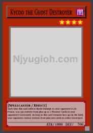 Kycoo the Ghost Destroyer DARK / Spellcaster / Level 4 / ATK 1800 / DEF 700 Each time this card inflicts Battle Damage to your opponent's Life Points, you can remove from play up to 2 Monster Cards in your opponent's Graveyard. As long as this card remains face-up on the field, your opponent cannot remove from play any cards in either Graveyard. SUPER RARE |