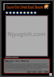 Galaxy-Eyes Cipher Blade Dragon LIGHT / Dragon-Type Xyz / Rank 9 / ATK 3200 / DEF 2800 3 Level 9 monsters You can also Xyz Summon this card by using a Rank 8 "Galaxy-Eyes" Xyz Monster you control as material. (Transfer its materials to this card.) Cannot be used as material for an Xyz Summon. Once per turn: You can detach 1 material from this card, then target 1 card on the field; destroy it. If this Xyz Summoned card you control, is destroyed by battle with an opponent's attacking monster, or destroyed by an opponent's card effect, and sent to your GY: You can target 1 "Galaxy-Eyes Cipher Dragon" in your GY; Special Summon it. ULTRA RARE |
