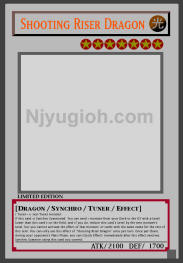 Shooting Riser Dragon LIGHT / Dragon-Type Synchro-Type Tuner / Level 7 / ATK 2100 / DEF 1700 1 Tuner + 1+ non-Tuner monster If this card is Synchro Summoned: You can send 1 monster from your Deck to the GY with a Level lower than this card's on the field, and if you do, reduce this card’s Level by the sent monster's Level, but you cannot activate the effect of that monster, or cards with the same name for the rest of this turn. You can only use this effect of "Shooting Riser Dragon" once per turn. Once per Chain, during your opponent's Main Phase, you can (Quick Effect): Immediately after this effect resolves, Synchro Summon using this card you control. ULTRA RARE |
