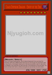 Chaos Emperor Dragon - Envoy of the End DARK / Dragon / Level 8 / ATK 3000 / DEF 2500 Cannot be Normal Summoned/Set. Must be Special Summoned (from your hand) by banishing 1 LIGHT and 1 DARK monster from your GY. You can pay 1000 Life Points; send as many cards in both players' hands and on the field as possible to the GY, then inflict 300 damage to your opponent for each card sent to the opponent's GY by this effect. You cannot activate other cards or effects during the turn you activate this card's effect. ULTRA RARE |
