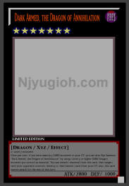 Dark Armed, the Dragon of Annihilation DARK / Dragon-Type Xyz / Rank 7 / ATK 2800 / DEF 1000 2+ Level 7 monsters Once per turn, if you have exactly 5 DARK monsters in your GY, you can also Xyz Summon "Dark Armed, the Dragon of Annihilation" by using 1 Level 5 or higher DARK Dragon monster you control as material. You can detach 1 material from this card, then target 1 card your opponent controls; destroy it, then banish 1 card from your GY, also, this card cannot attack for the rest of this turn. ULTRA RARE |