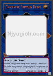 Trickstar Crimson Heart LIGHT / Fairy-Type Link / ATK 2000 / Link-2 2 "Trickstar" monsters Each time a "Trickstar" monster(s) is Normal or Special Summoned to a zone(s) this card points to, gain 200 LP. You can discard 1 "Trickstar" card; both players draw 1 card, but if your LP was at least 2000 higher than your opponent's when this effect was activated, you draw 2 cards instead. You can only use this effect of "Trickstar Crimson Heart" once per turn. ULTRA RARE |